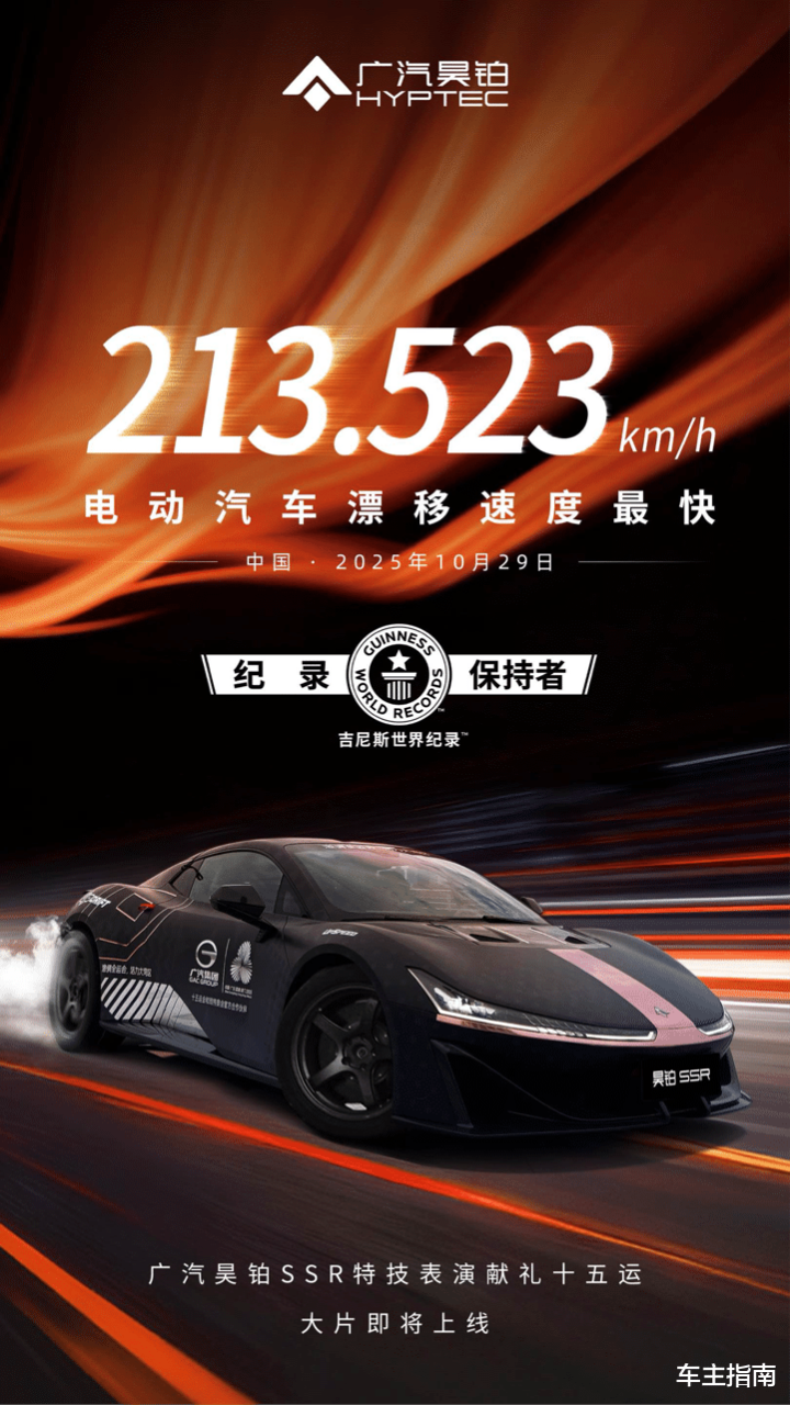 2025年10月29日,广汽昊铂旗下纯电超跑昊铂SSR刷新了纯电车漂移最高时速吉尼斯世界纪录。中国漂移车手叶志成驾驶昊铂SSR完成极限漂移挑战,在30度漂移角度维持超50米的高难度条件下,以213.523km/h的漂移速度刷新了纯电车漂移最高时速世界纪录。